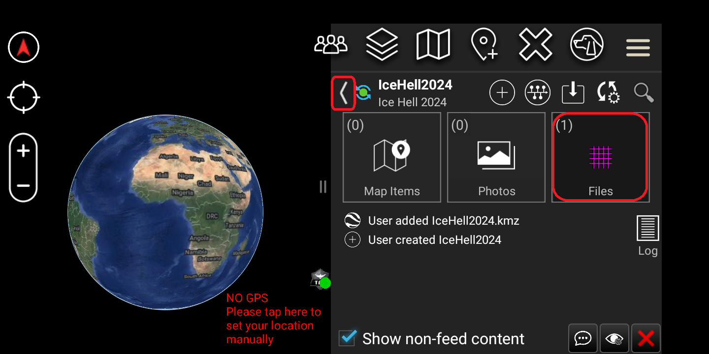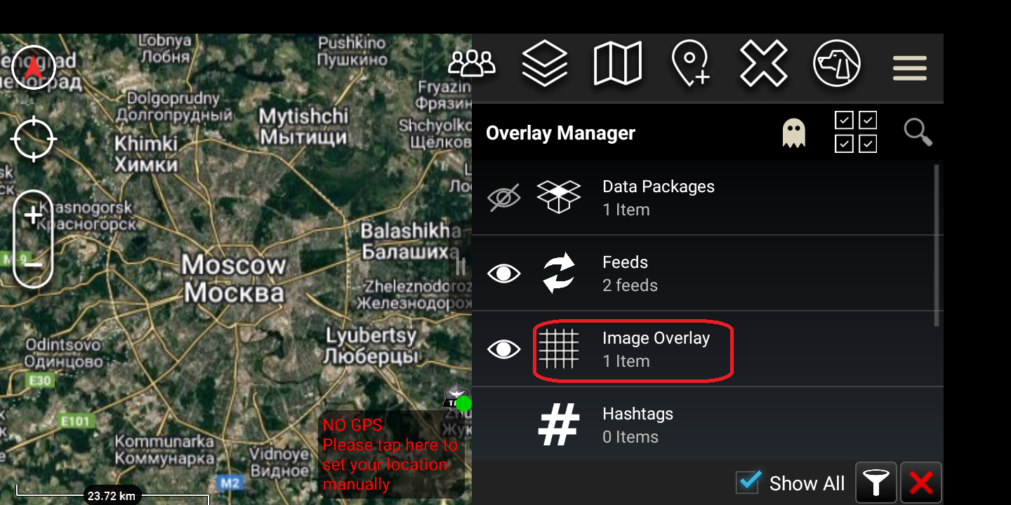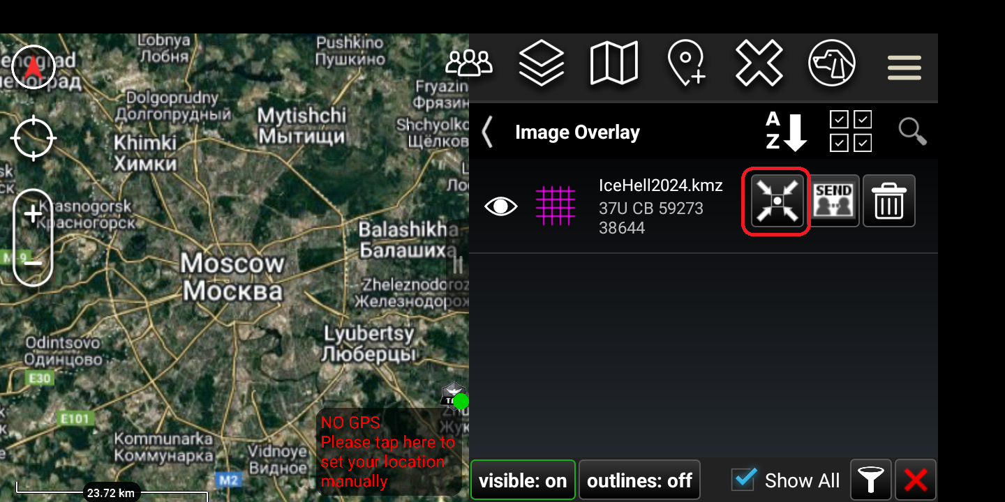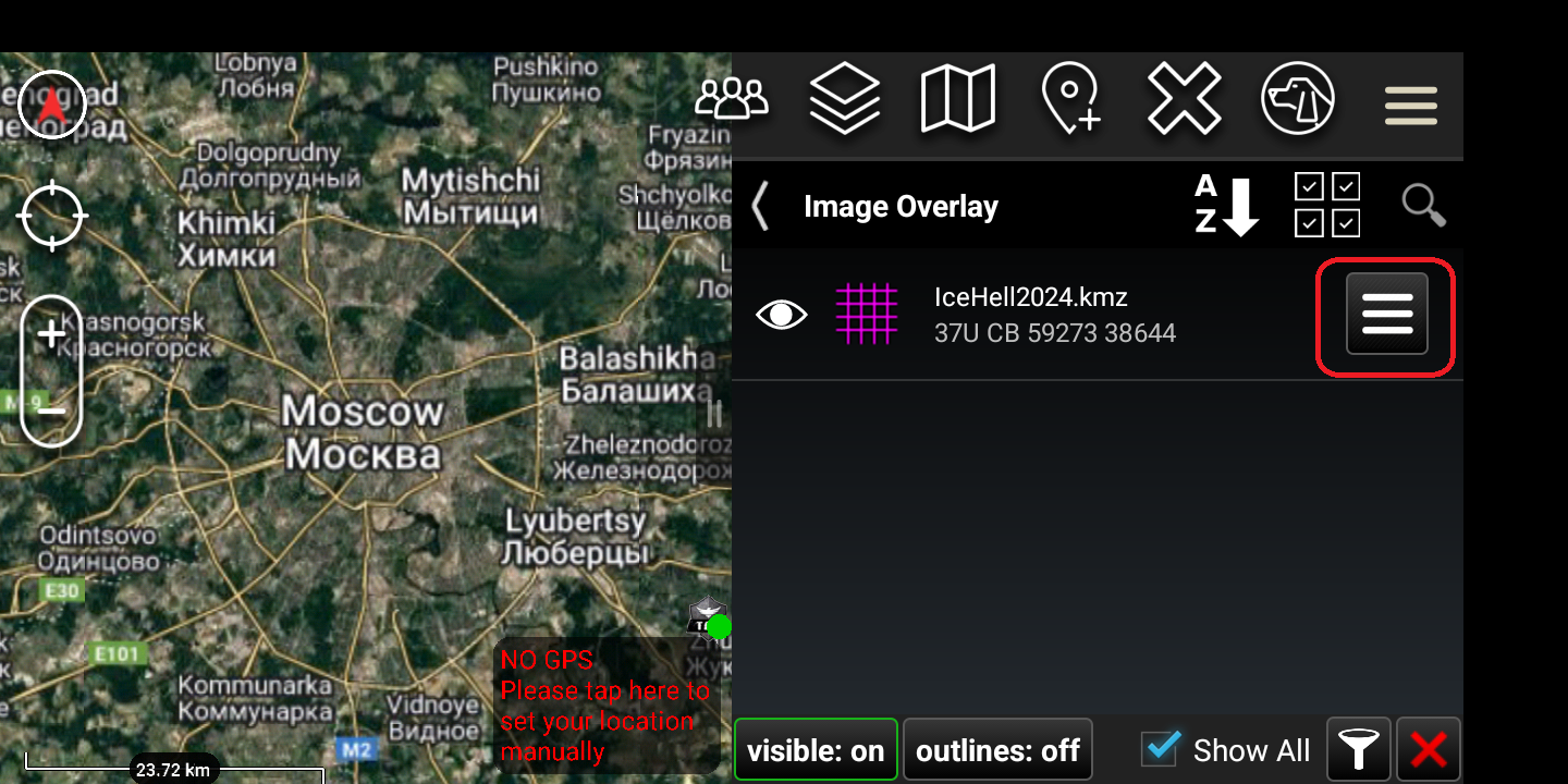 - Убедитесь, что KMZ обнаружена и загружена. Нажмите ⬅️ для выхода из Overlay Manager