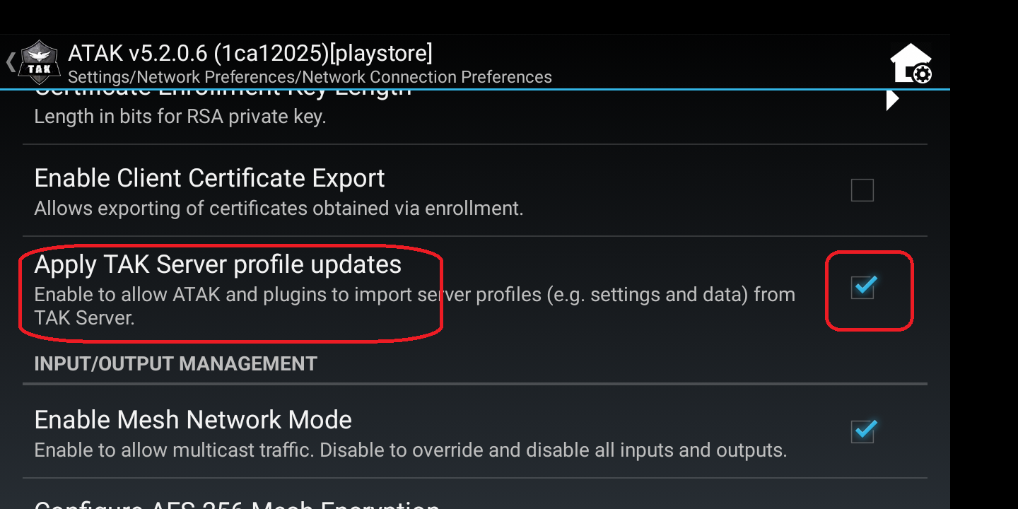 - Проставьте чекбокс в Apply TAK Server profile updates